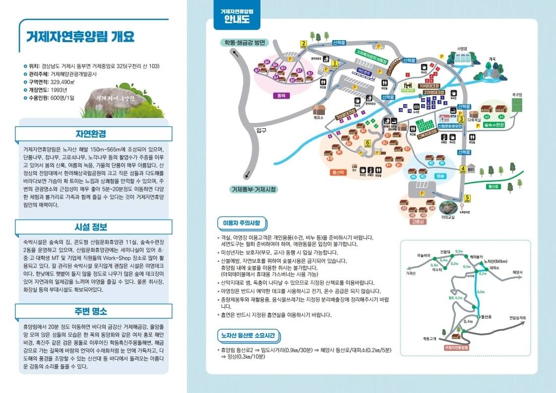 거제자연휴양림은 동부면 구천리 노자산 해발 150~565m에 위치하고 산 정상의 전망대에서 거제 전역과 한려해상국립공원의 크고, 작은 섬들과 대한해협 대마도를 바라보면 가슴이 확 트인 느낌과 상쾌함을 만끽 할 수 있다.