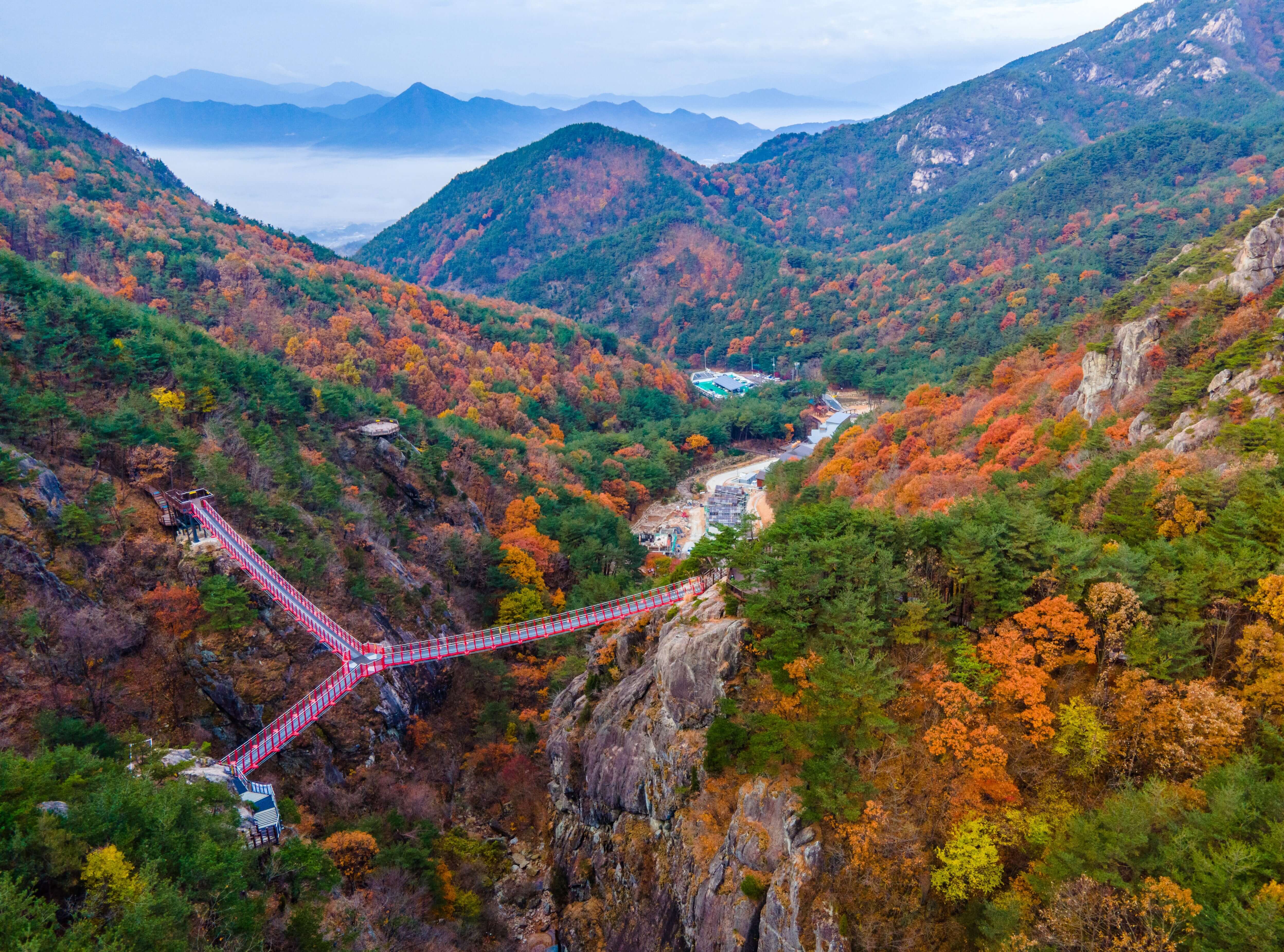 거창 항노화 힐링랜드는 해발 1,046m의 우두산 자락에 위치하여 천혜의 산림환경을 활용해 힐링과 치유를 주제로 조성되었다. 특히 국내 최초로 교각 없는 Y자형 출렁다리와 누구나 안전하고 편안하게 걸을 수 있는 무장애 데크로드가 설치되어 있다.