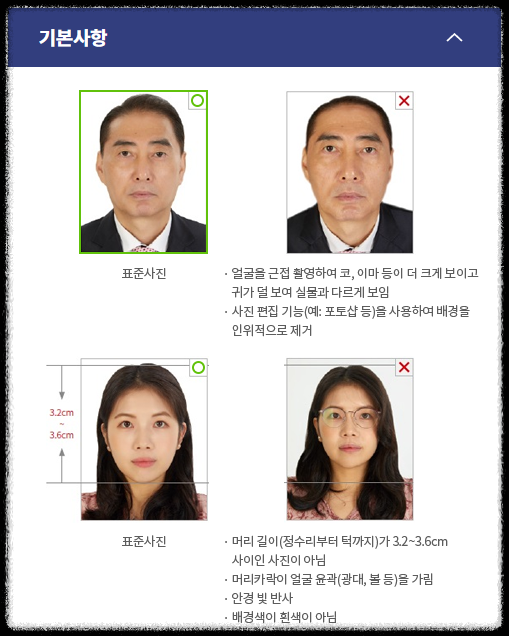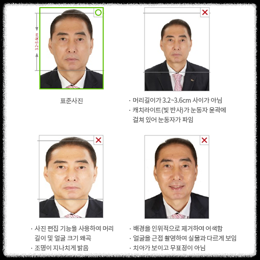 - 본인이 직접 촬영한 사진은 여권사진 규격에 적합한 경우에만 사용 가능함