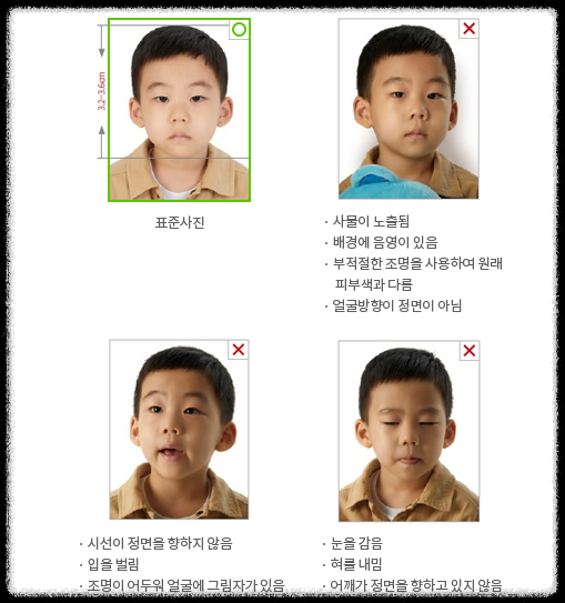 - 본인이 직접 촬영한 사진은 여권사진 규격에 적합한 경우에만 사용 가능함