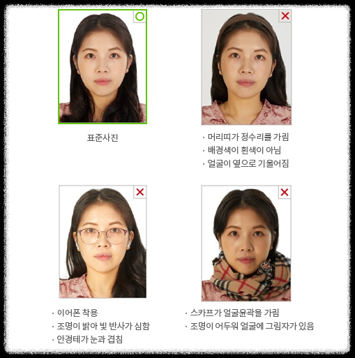 - 머리가 중앙에 위치해야 하며, 얼굴과 어깨는 정면을 향해야 함(측면포즈 불가)