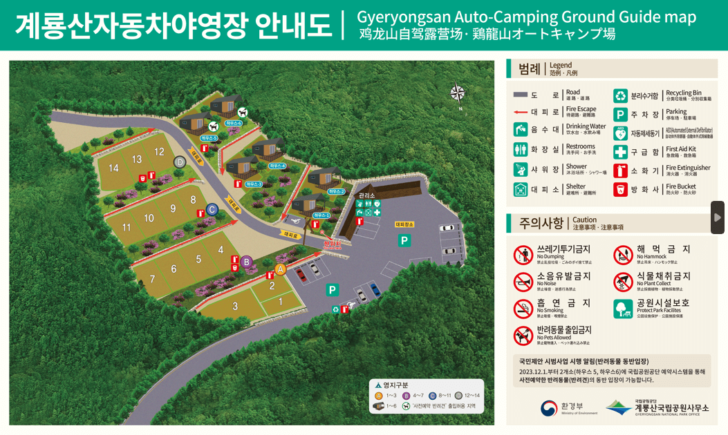 | 입퇴실시간 | A/B/C/D영지(자동차야영지): 오후 14시~익일 오전 12시(정오) 하우스(1~6): 오후 15시~익일 오전 11시 |