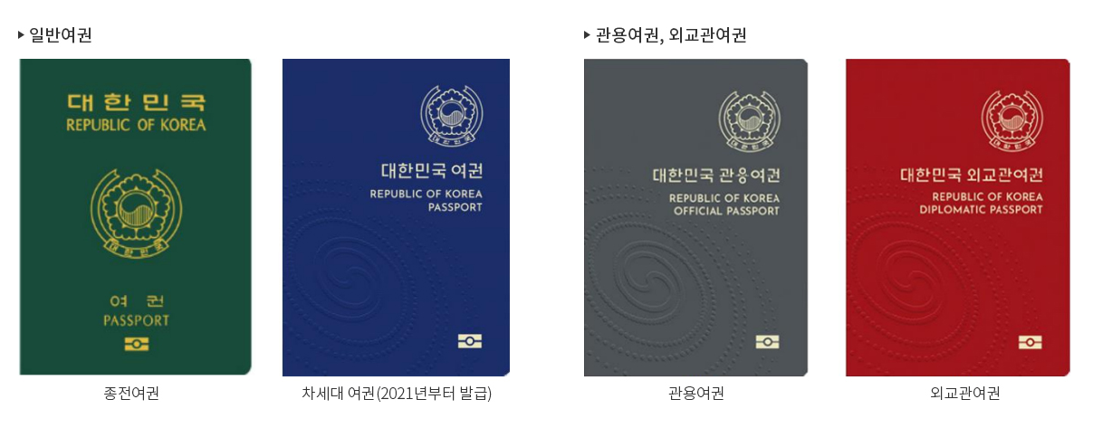 - 복수여권 : 유효기간 중 횟수에 제한없이 여행을 할 수 있는 여권으로 10년 이내의 유효기간 부여 (단, 만18세 미만자는 유효기간 5년 여권발급)