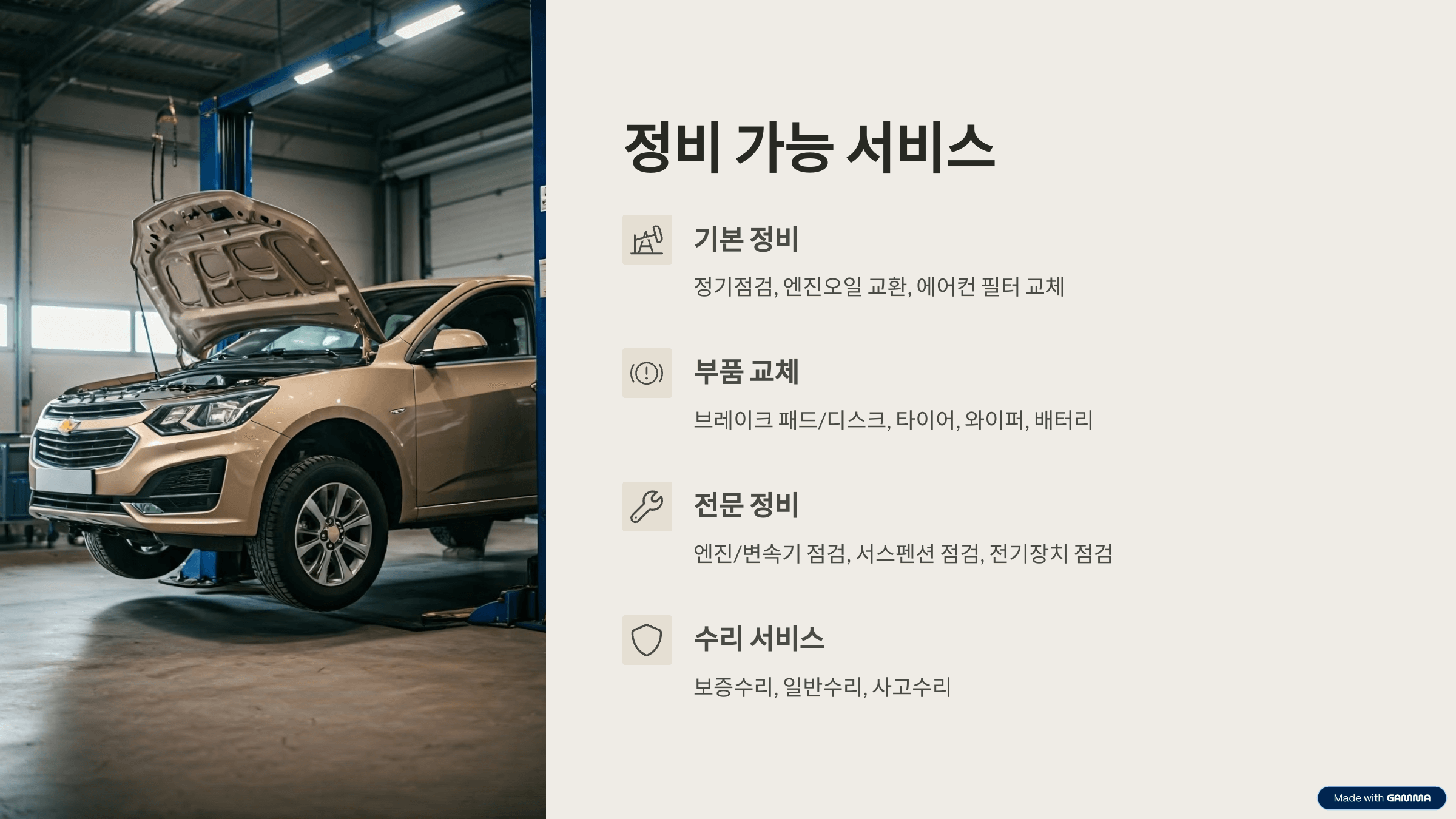 정기점검, 엔진오일 교환, 브레이크 패드/디스크 교체, 타이어 교체, 와이퍼 교체, 배터리 교체, 에어컨 필터 교체, 서스펜션 점검, 엔진/변속기 점검, 전기장치 점검, 소모품 교체, 보증수리, 일반수리, 사고수리