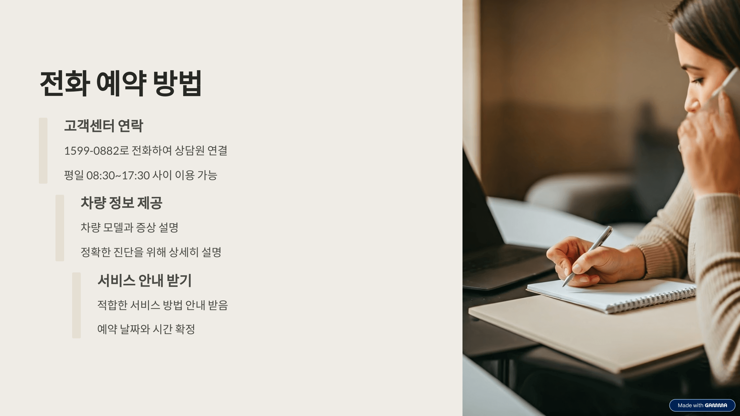 1599-0882로 전화하셔서 상담원과 통화하실 수 있습니다. 차량 모델과 증상을 말씀해 주시면 적합한 서비스 방법을 안내받으실 수 있습니다. 전화 예약은 평일 08:30~17:30 사이에 가능합니다.
