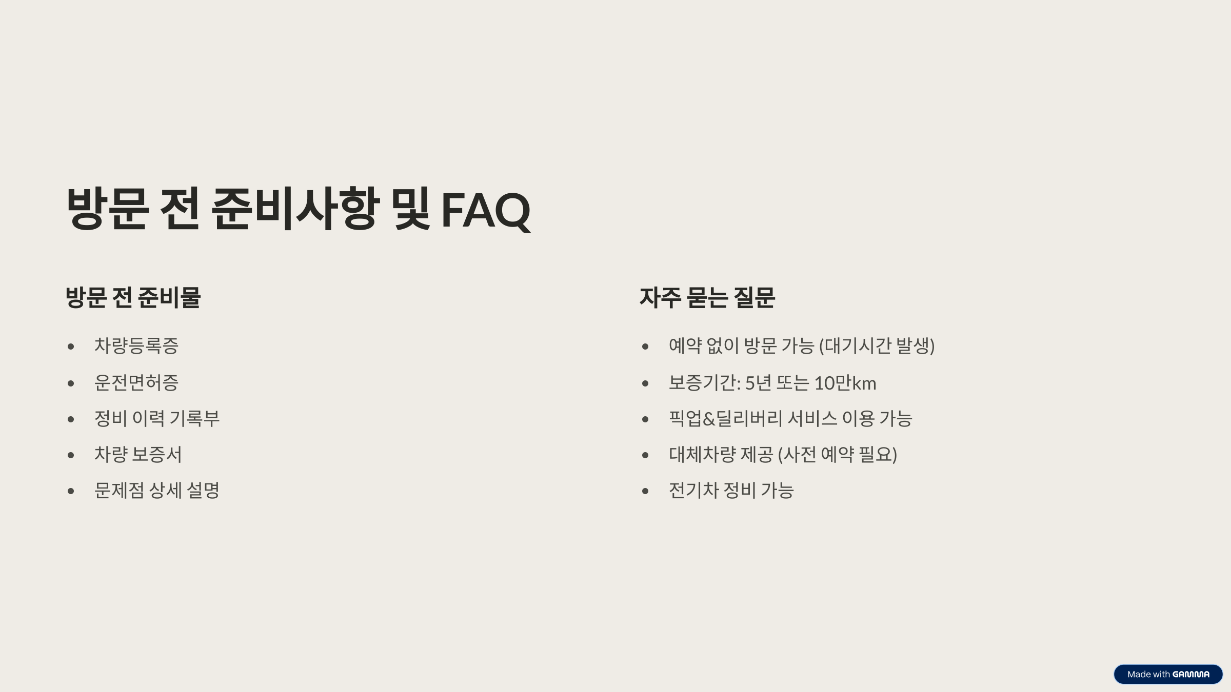 정기점검, 엔진오일 교환, 브레이크 패드/디스크 교체, 타이어 교체, 와이퍼 교체, 배터리 교체, 에어컨 필터 교체, 서스펜션 점검, 엔진/변속기 점검, 전기장치 점검, 소모품 교체, 보증수리, 일반수리, 사고수리