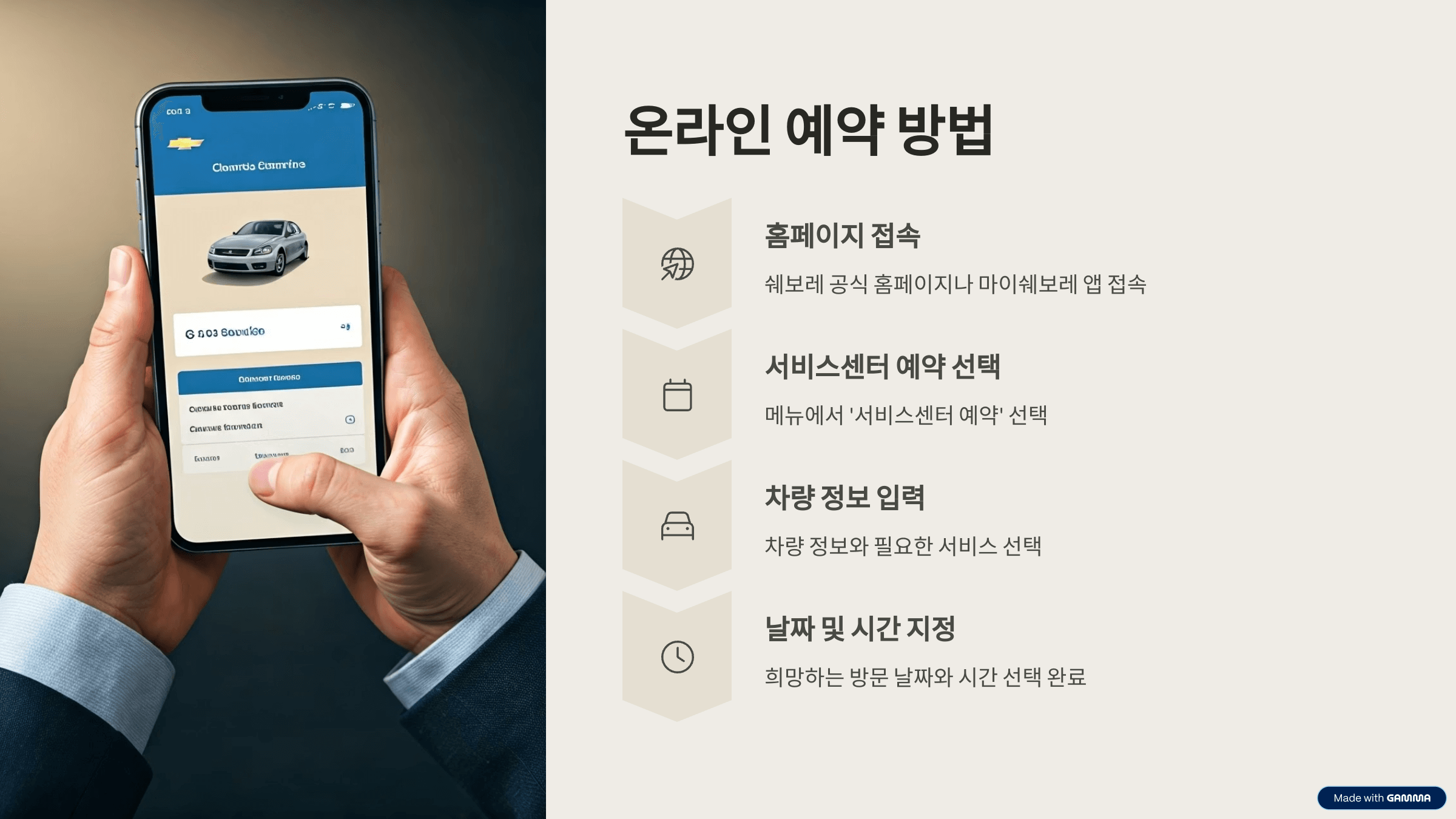 쉐보레 공식 홈페이지나 마이쉐보레 앱에서 예약하실 수 있습니다. '서비스센터 예약' 메뉴를 선택한 후, 차량 정보와 필요한 서비스를 선택하고 희망하는 날짜와 시간을 지정하면 됩니다. 또한 픽업&딜리버리 서비스가 필요한 경우 추가 정보를 입력하시면 됩니다.