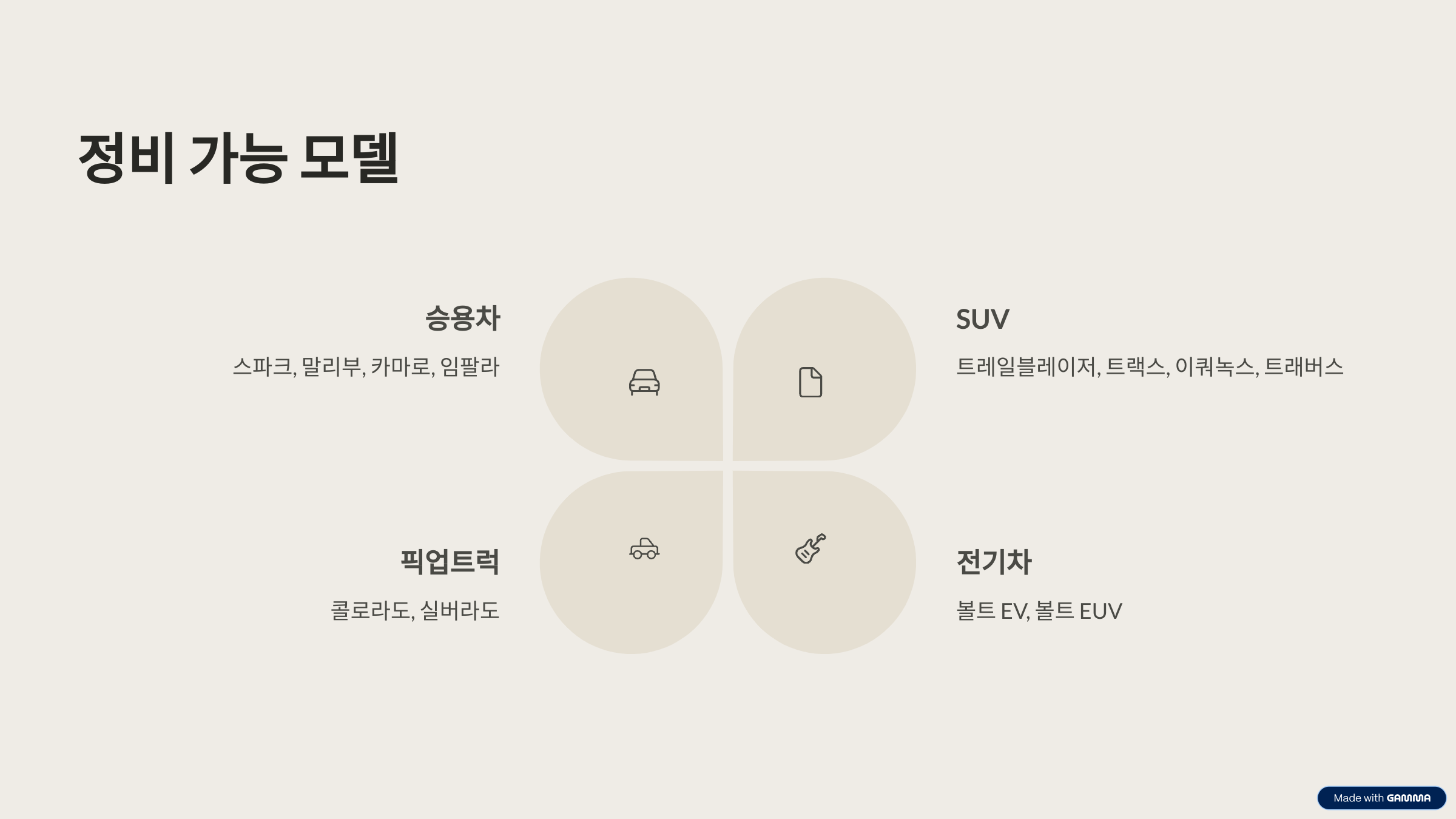 | 승용차 | SUV | 전기차 | 픽업트럭 |