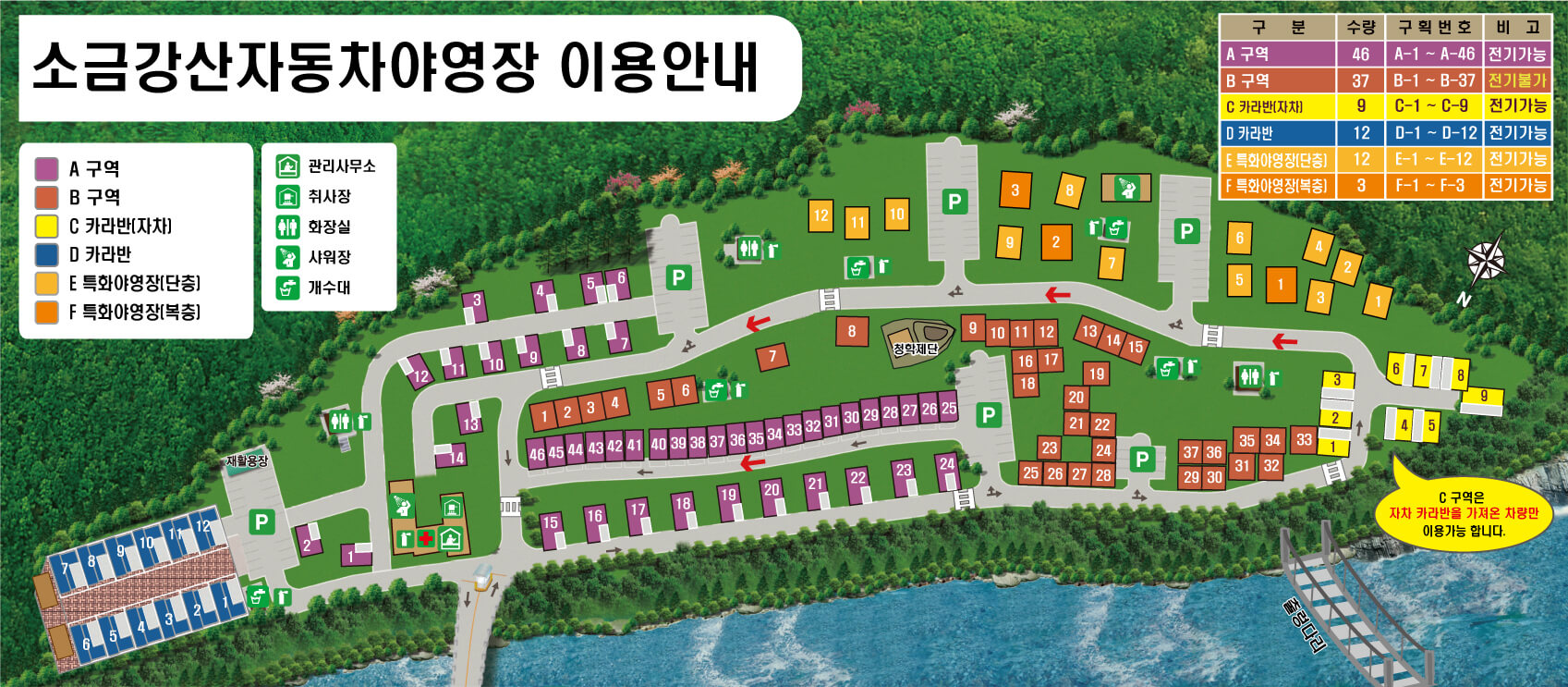 | 편의시설 | 테이블, 개수대, 전기(A,C영지 : 전기사용 가능, B영지 : 전기사용 불가), 탐방로, 카라반, 코인샤워장 |