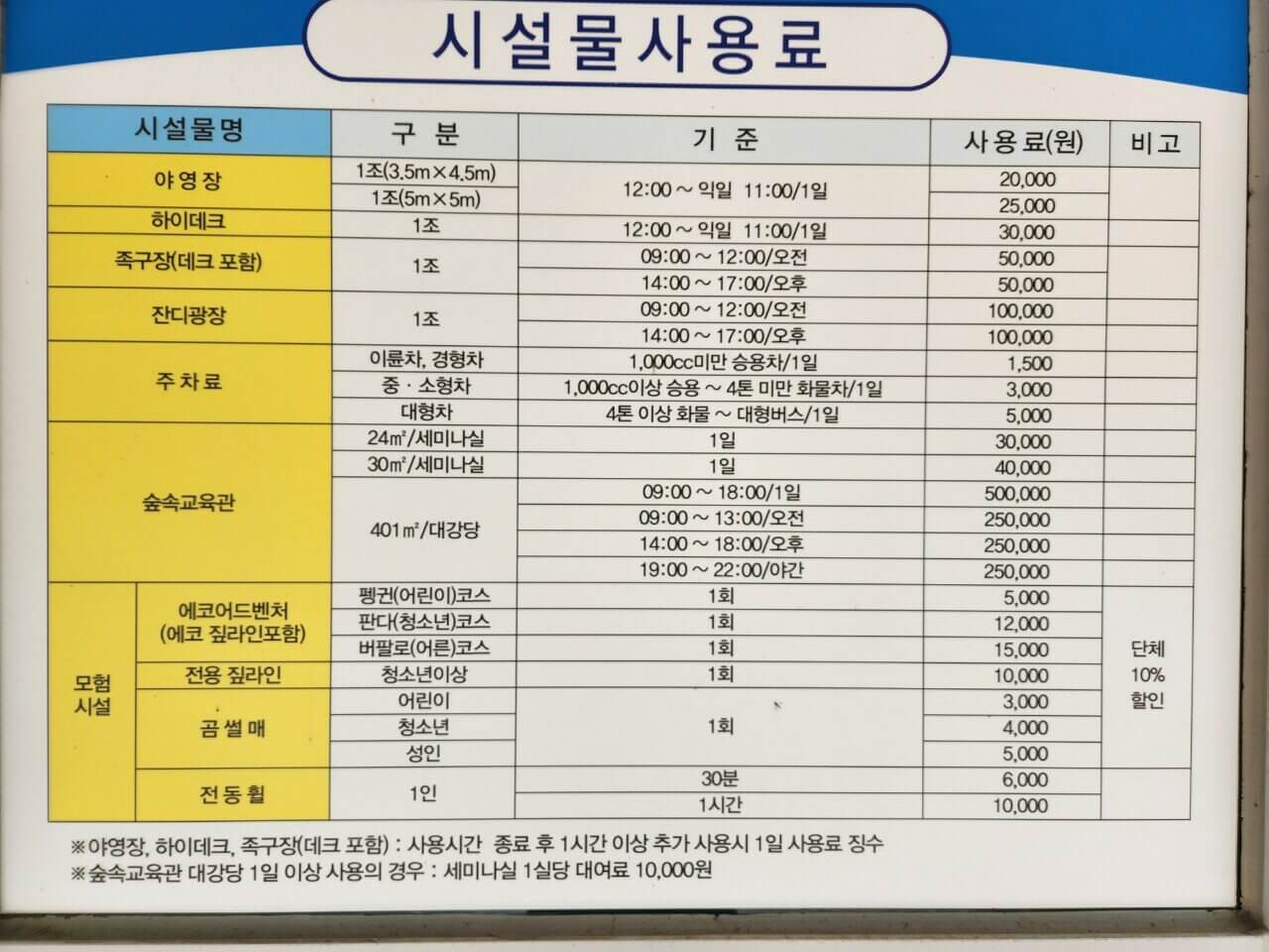 - 도착당일 오후 15시 00분부터 예약종료일 오전 11시 00분까지(소형산막 및 산림문화휴양관 포함)