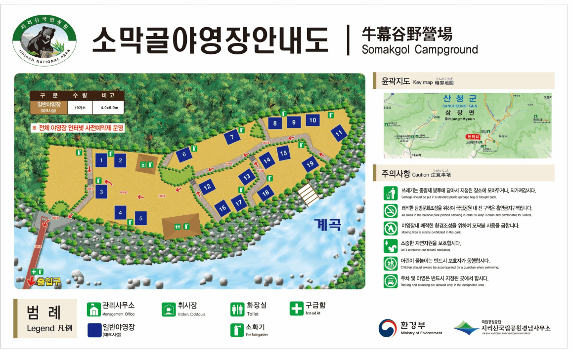 경남 산청군 삼장면에 위치한 지리산국립공원 소막골 야영장(캠핑장)입니다. 주소 및 문의처, 입퇴실시간, 이용금액, 예약방법 등을 꼼꼼하게 확인하신 뒤에 예약하시는 것을 추천드립니다.