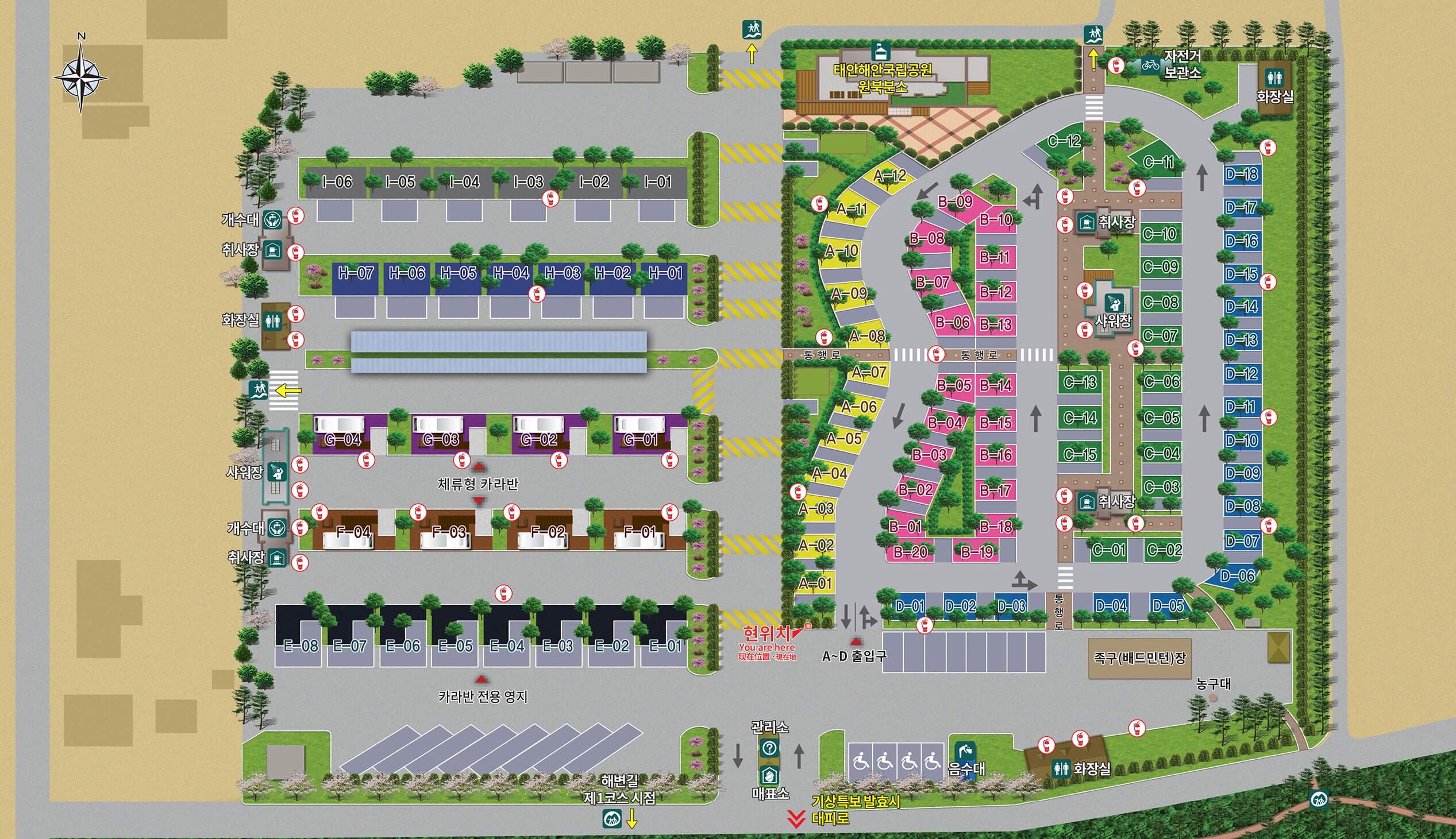 | 영지유형 | 89동(자동차 야영지 73동, 캠핑용자동차전용야영지 8동, 체류형 카라반 8동) |